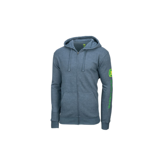 John Deere navyblå fleece fuld lynlås sweatshirt med hætte og varemærke logo skærm print på ærmet. Materiale: 60% bomuld 40% polyester