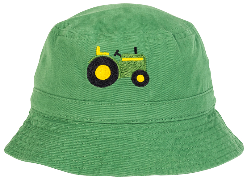 Grøn John Deere bøllehat med traktor foran til børn/småbørn. Hættens omkreds kan variere fra ca. 47 cm til 52 cm. Materiale: 100 % bomuld.