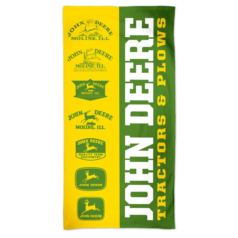 Badehåndklæde med John Deere retrologo. Grønt/gult badehåndklæde med John Deere logoer gennem tiden. Materiale: 50 % polyester, 50 % bomuld. 76,2 cm x 152,4 cm.