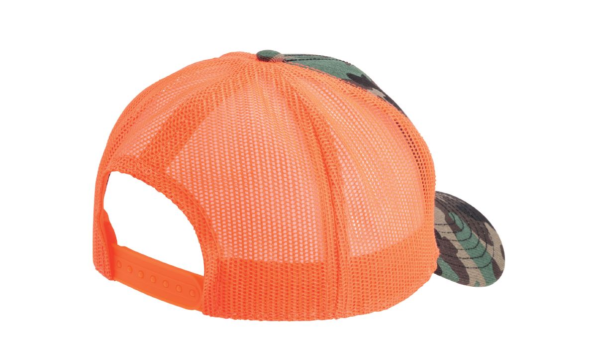 Warn Kappe Camouflage in Orange mit besticktem Logo und anpassbarem Snapback-Verschluss. Material: Vorne 100 % Baumwolle, Hinten 100 % Polyester
