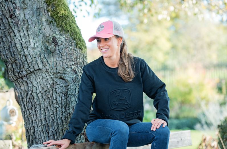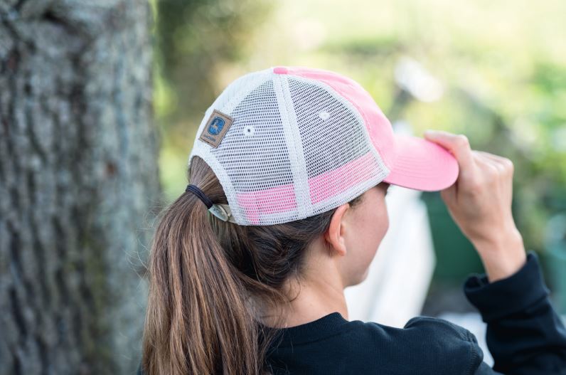 John Deere Vintage Cap in Pink mit Kunstlederpatch und anpassbarem Snapback-Verschluss. Material: Vorne 100 % Baumwolle, Hinten 100 % Polyester