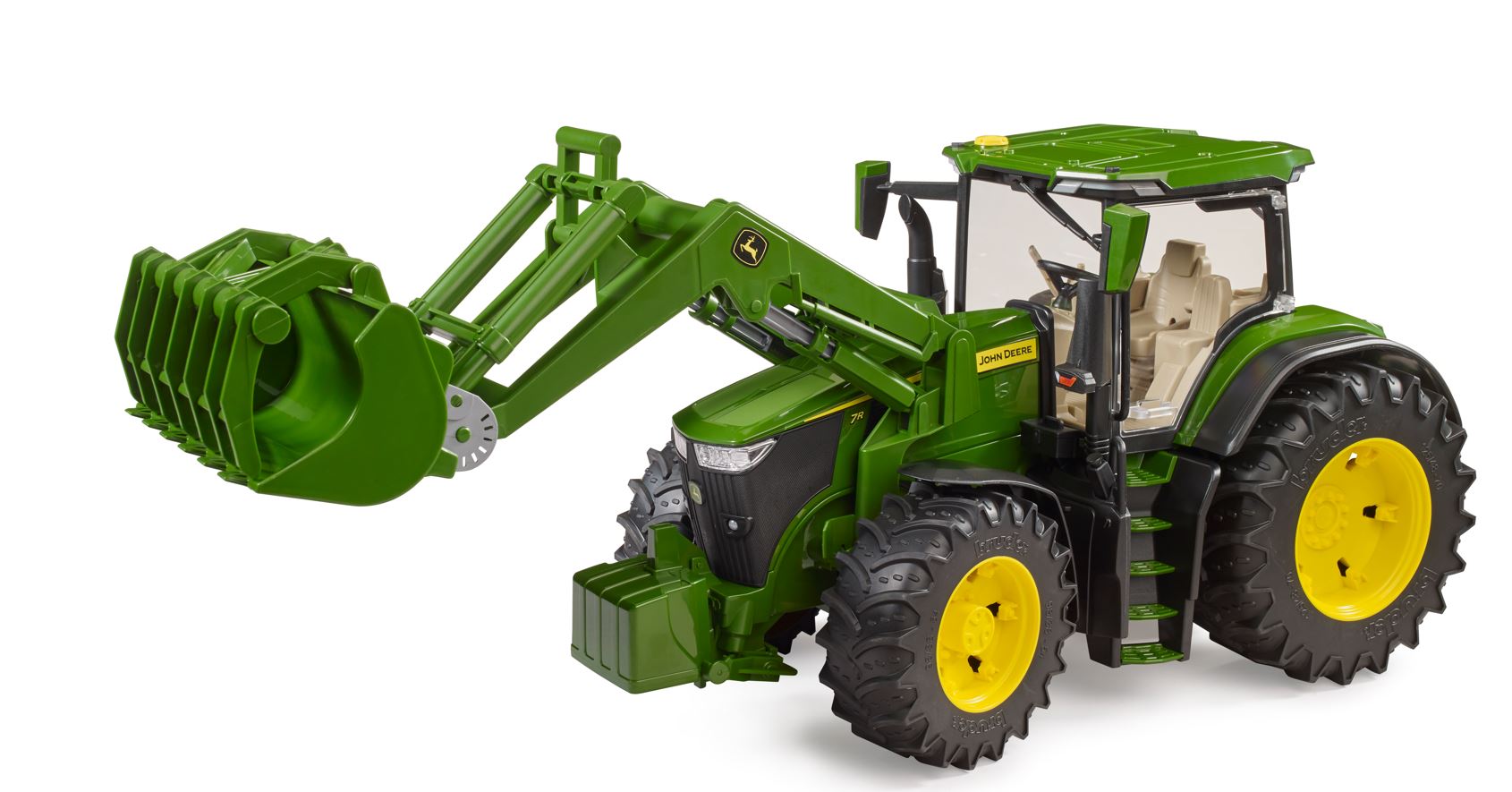 Kabinenfenster aus durchsichtigem und bruchsicherem Kunststoff. Kabinentüren und Motorhaube lassen sich öffnen. Zusätzliche Lenkstange ermöglicht das Lenken durch das Schiebedach des Traktors.