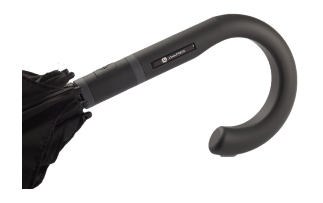 Schwarzer Regenschirm in Normalgröße mit praktischer Automatikfunktion für schnelles Öffnen und Schließen sowie hochwertigem Windschutzsystem für maximale Gestellflexibilität bei stärkerem Wind dank biegsamer Schienen in Grau. John Deere Logo auf einem Segment sowie im Griff. Material: 100 % recyceltes Polyester