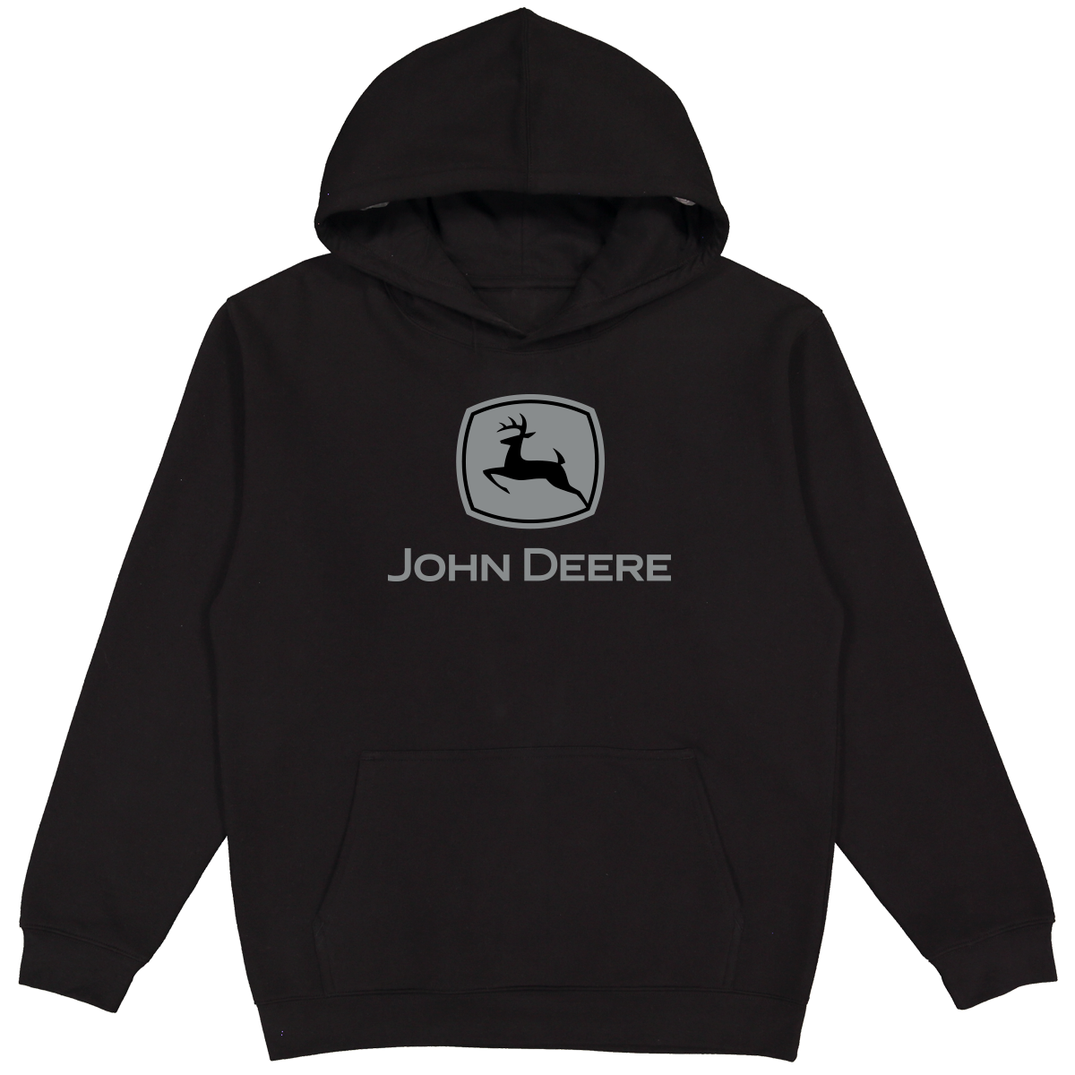 John Deere black fleece hooded sweatshirt with trademark logo screen print on front. Material: 55% Cotton, 45% Polyester.