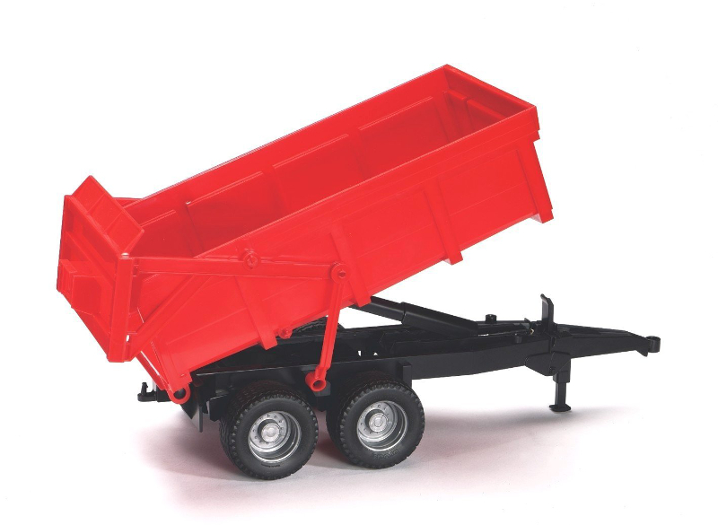 Side view of a red dump trailer scaled model with its bed raised, featuring a black chassis and two axles with four wheels.
