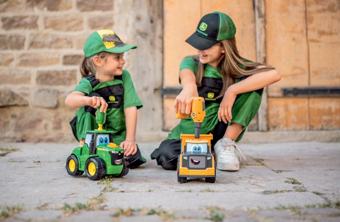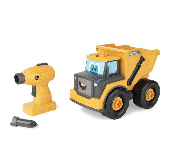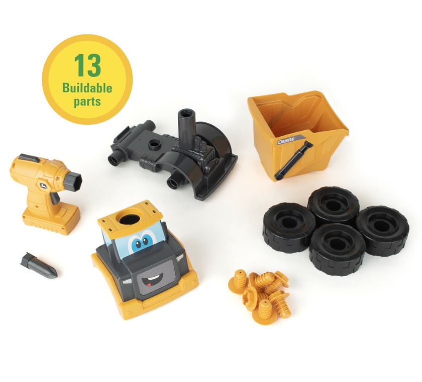 The John Deere Build A Yellow Dump Truck features two great ways to play! This 13 piece construction toy includes a drill and one bit that lets kids take it apart and put it back together again which is great for encouraging problem solving skills. Made of chunky parts, it's easy for little hands to assemble and maneuver into place. But the fun doesn't stop there! Put together, this dump truck is a great push-along toy for lots of on-the-floor fun. It also features a working dump bed that lets kids haul around all of their favorite treasures. This dump truck toy comes complete with 2 AA batteries pre-installed so that the fun can start right away!