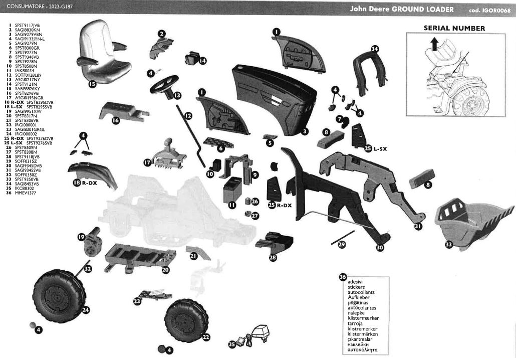 The 12V tractor with front loader enables many playing opportunities on the farm. It's equipped with 2 forward gears and 1 reverse gear. The Ground Loader features an integrated FM radio for additional fun. Adjustable seat accommodates child’s growth. The loader can be controlled from the driver’s seat. Functions: scoop, lift and dump. Measurements: ca. 170 x 63 x 68 cm. From ages 3+. Lithium battery.