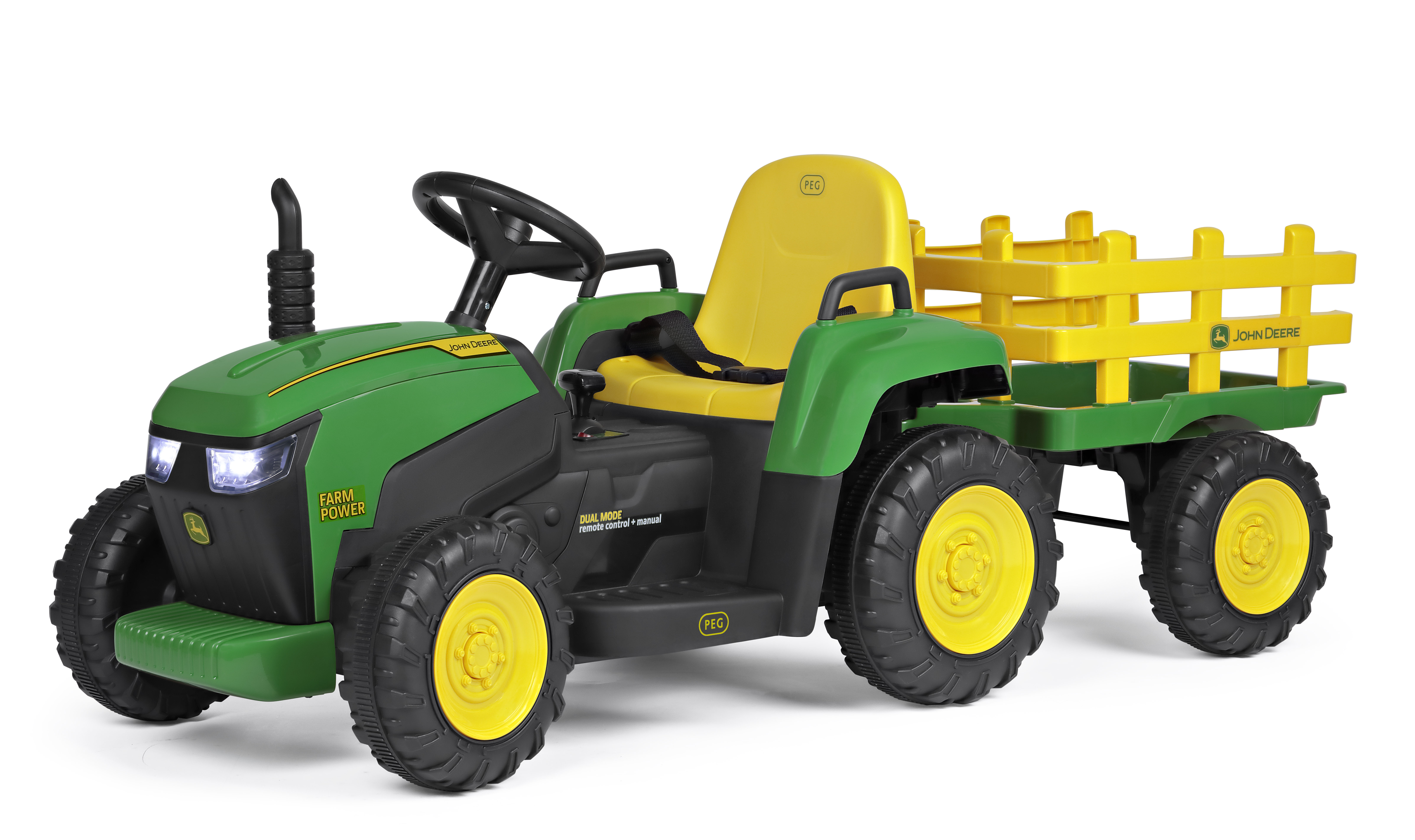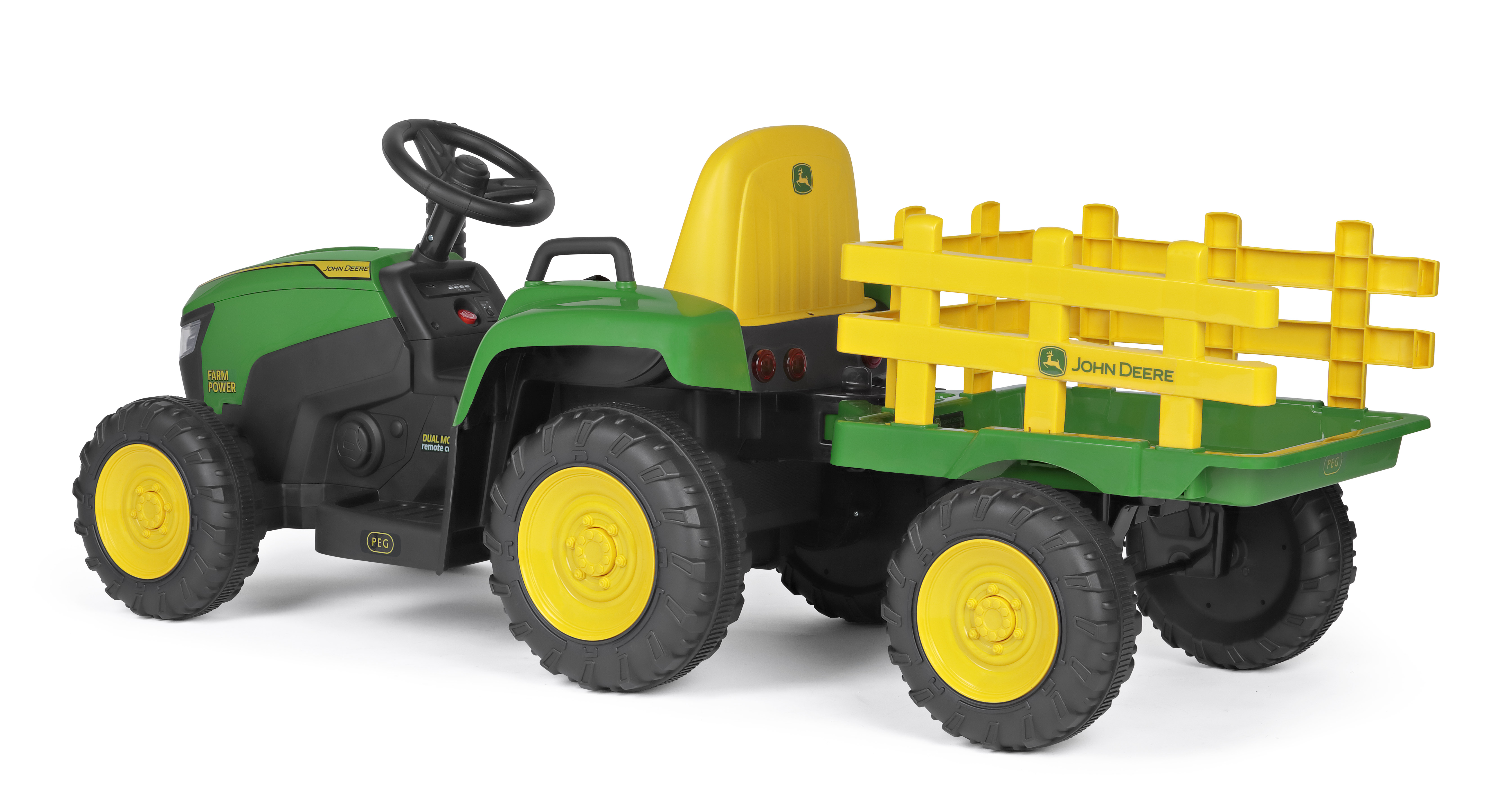 The electric tractor with trailer driven by children and radio-controlled by adults! John Deere Farm Power is the electric tractor most desired by children and… adults. From 18 months to 3 years, the tractor can be driven by an adult via radio control; from 3 years, it can be driven by children for fantastic adventures.