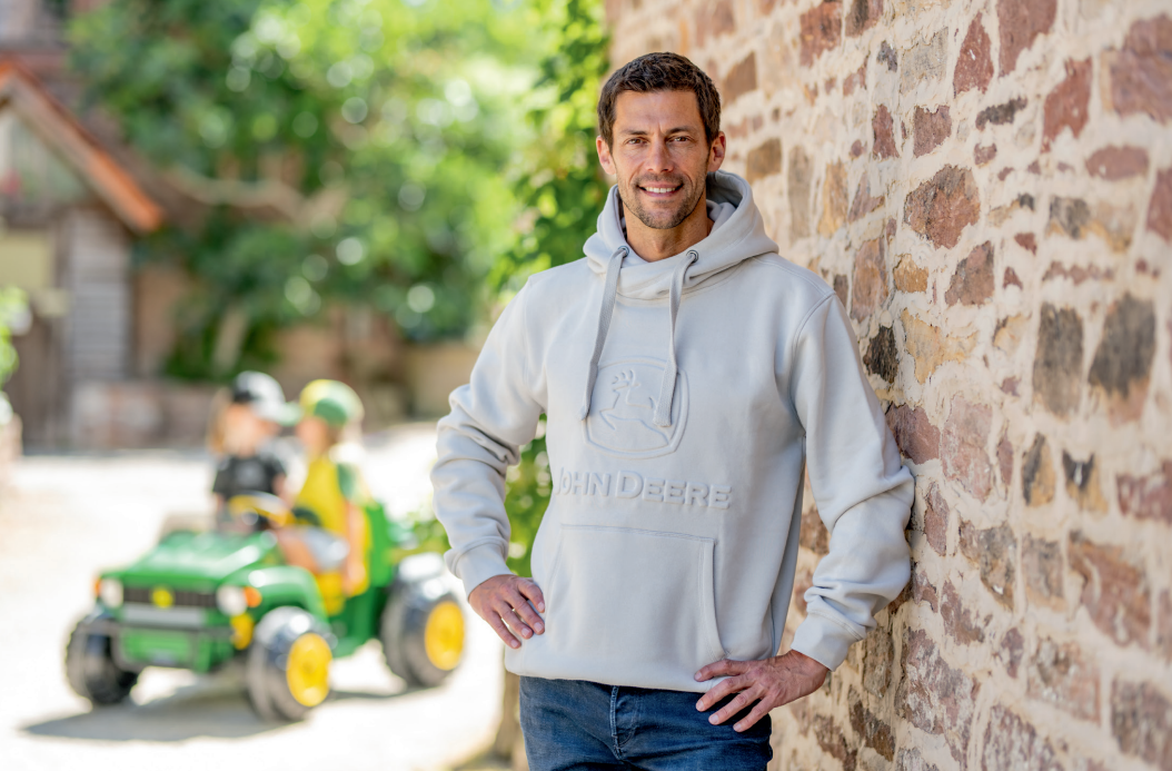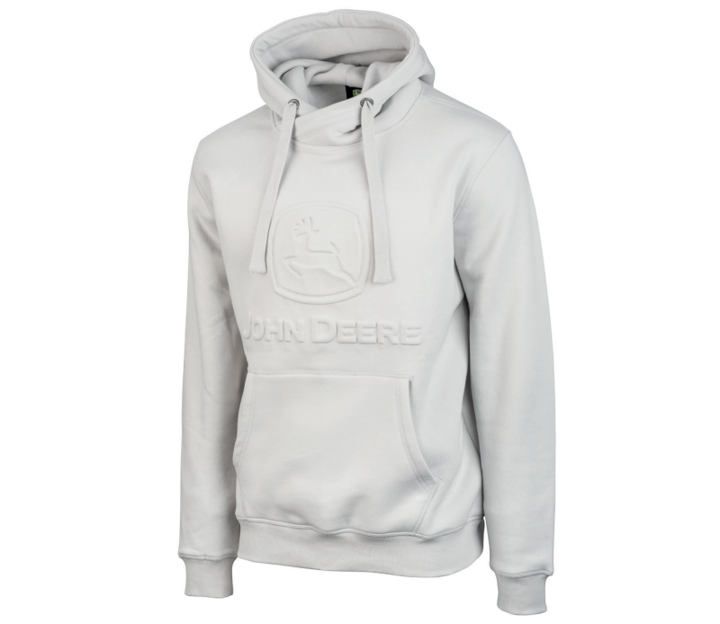 Comfortable sweatshirt in light grey with embossed John Deere Logo on the chest and kangaroo pocket at the front. Material: 80% cotton, 20% polyester.