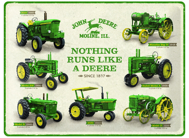 Front view of a vintage-style metal sign displaying multiple green and yellow John Deere tractor models with the slogan 'Nothing Runs Like a Deere'.