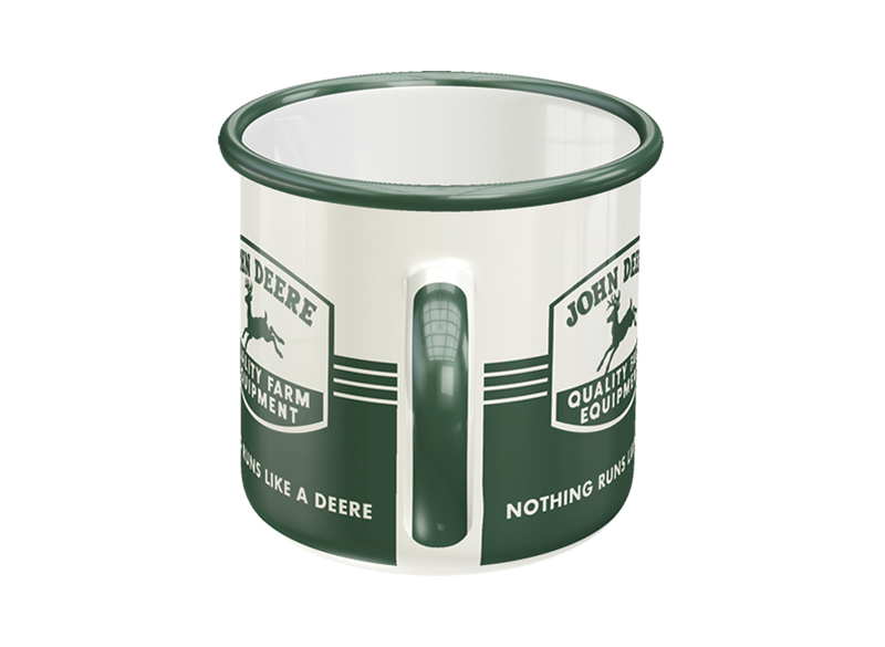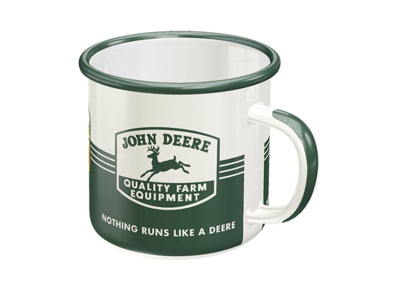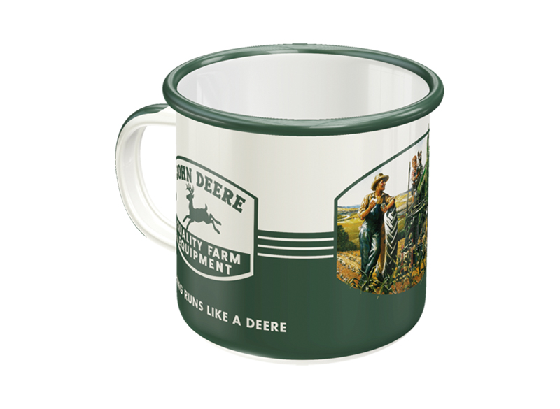 Angled view of a white and green enamel mug with a John Deere logo and a vintage illustration of a farmer next to a tractor.