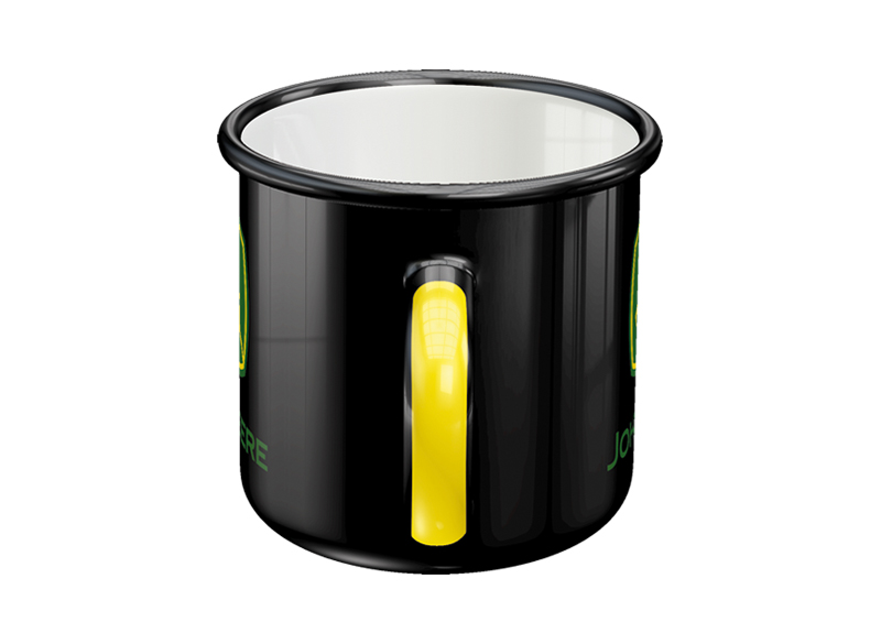 Angled view of a black enamel mug with white interior, featuring the John Deere logo and a black handle with a yellow stripe.