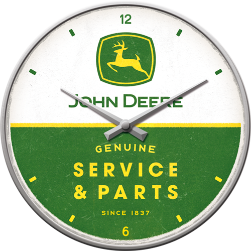 This high-quality John Deere wall clock is characterised by a domed glass front, a metal casing and a battery-operated quartz movement. The clock has a diameter of 31 cm and a depth of approx. 5.5 cm. It is shipped in sturdy cardboard packaging and without a battery.