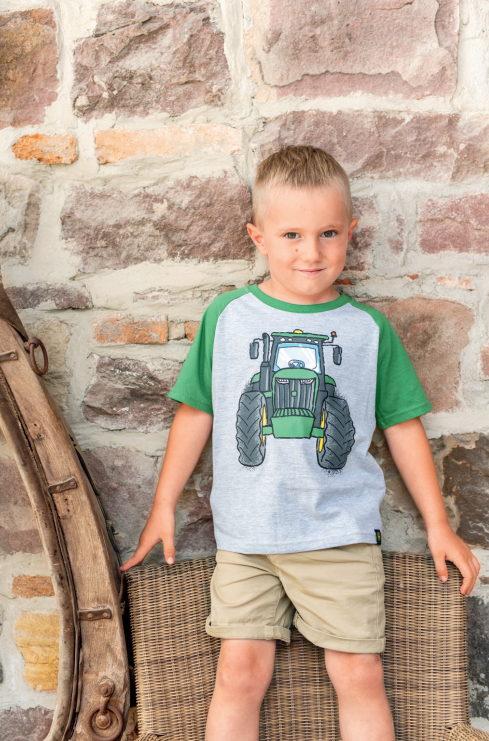 Toddler / kids t-shirt light grey / green t-shirt with tractor coming on front and tractor going on the back. Truly an eyecatcher from every angle. Material: 90% cotton 10% polyester