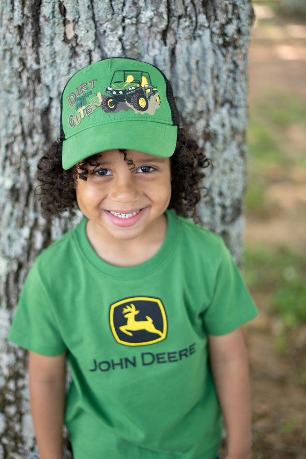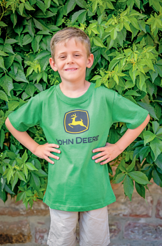 John Deere kids green t-shirt with trademark logo screen print on front. Material: 100% cotton.
