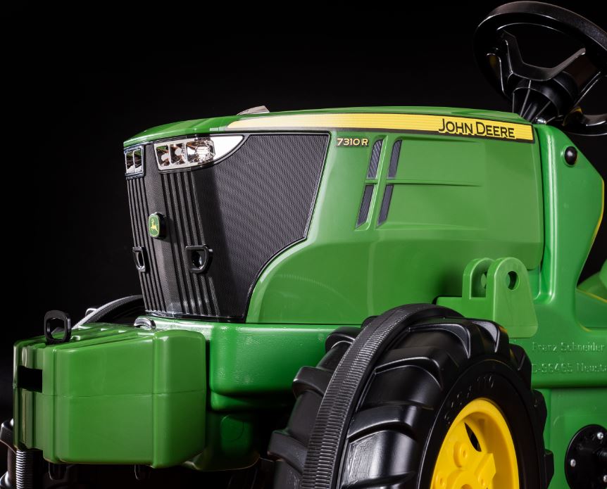 rollyFarmtrac John Deere 7310R - incl. rollyTrac Lader, front loader easily to be attached, front loader easily removable, adjustable seat, rollover bar, hood can be opened, storage place under the hood, frontweight, front- and rear coupling, optimized turning circle by stub axle steering, low-noise wheel tread band, adjustable chain tension, protected chain drive, sturdy steering rod, functional accessories can be added. This toy is suitable for children from the age of 3 years with a body height of between 104 cm and 134 cm.