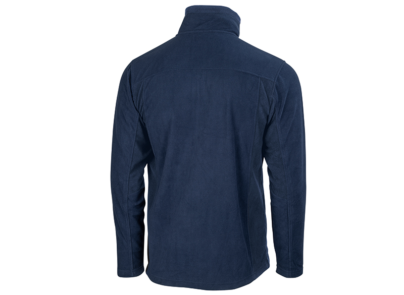 Back view of a navy blue fleece jacket with black side panels and a stand-up collar.