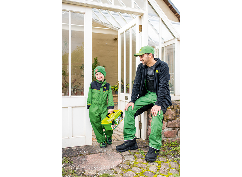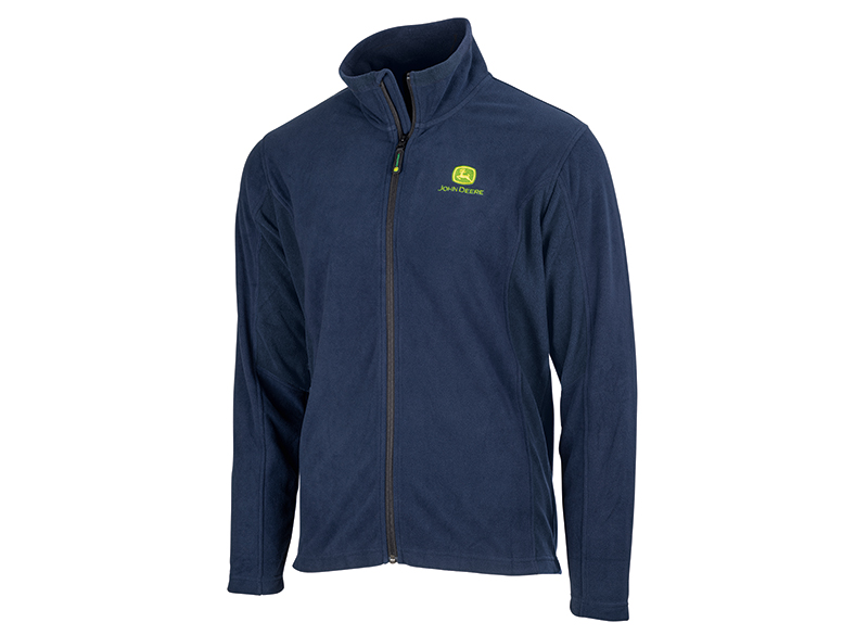 Front view of a navy blue and black John Deere full-zip fleece jacket with a stand-up collar and logo on the chest.