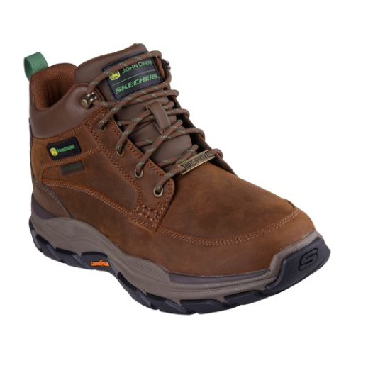 Stay supported in all-day comfort with Skechers x John Deere. This Relaxed Fit® Terrafoam Veckman mid-top features a waterproof leather upper with a lace-up, Skechers Air-Cooled Memory Foam® insole and Goodyear® rubber outsole.