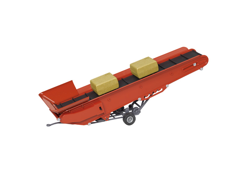 Electronically operated moving conveyor made of die-cast metal with plastic frame and conveyor. Adjustable angle positions facilitate several conveyors to build a conveyor series in sequence. The towing bar facilitates coupling with any SIKU tractor in scale 1:32 for transport to a new working location. Suitable for ages 3+.