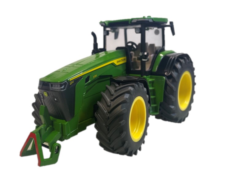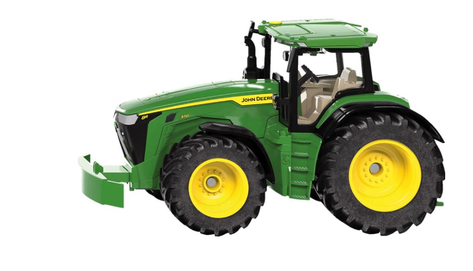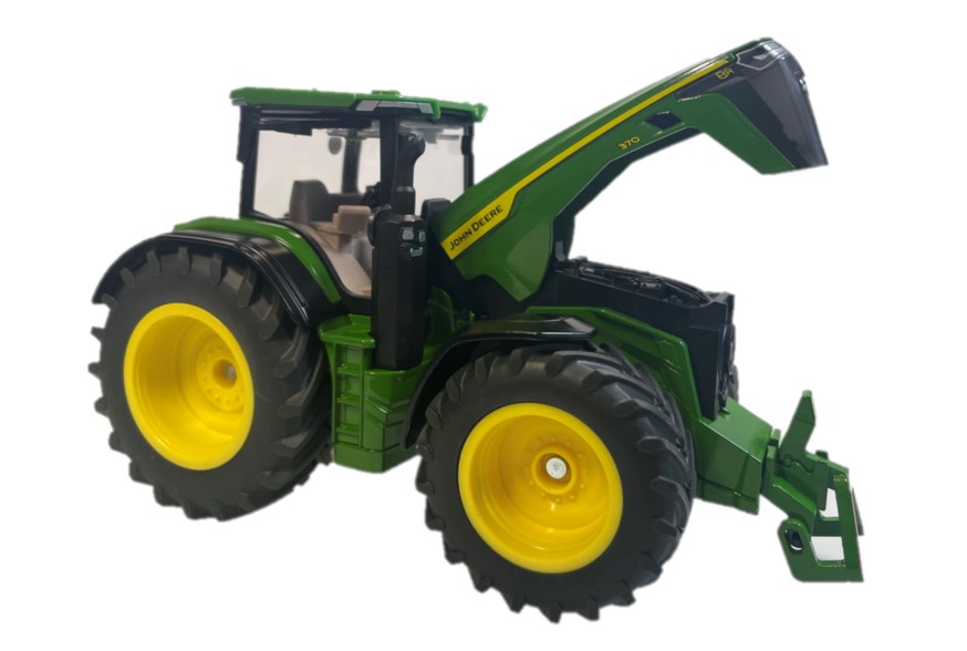 High detailed replica of the new John Deere 8R 370 tractor in scale 1:32, made of die-cast with plastic parts. The front coupling can now be removed, and replaced very simply by the front weight provided. This provides additional play options to the functions of the rear coupling. The tractor can be steered using the steering wheel, simply by removing the cab. The front bonnet opens, providing a view of the mighty six-cylinder engine. Suitable for ages 3+