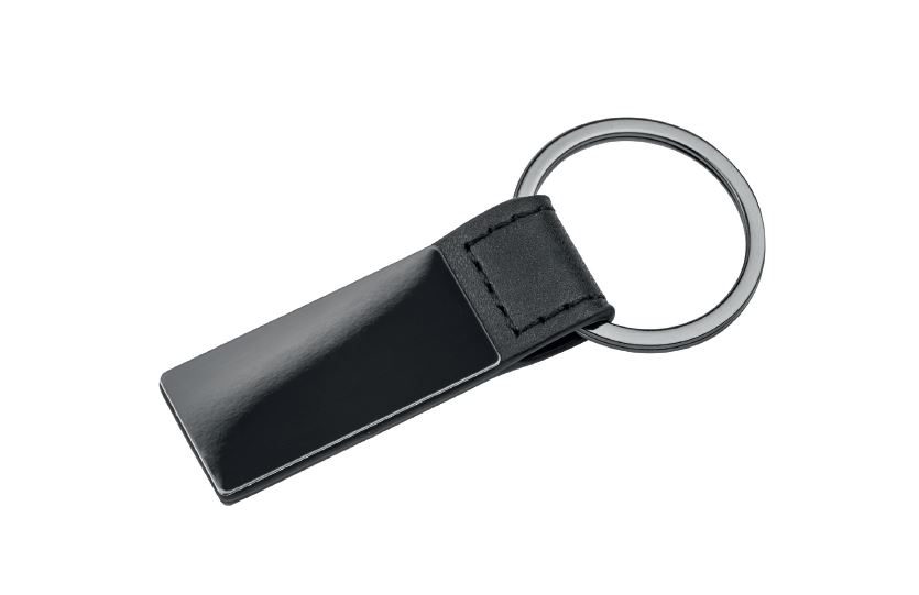 The keyring is made of black faux leather and black gunmetal plating. Printed John Deere logo on metal part.