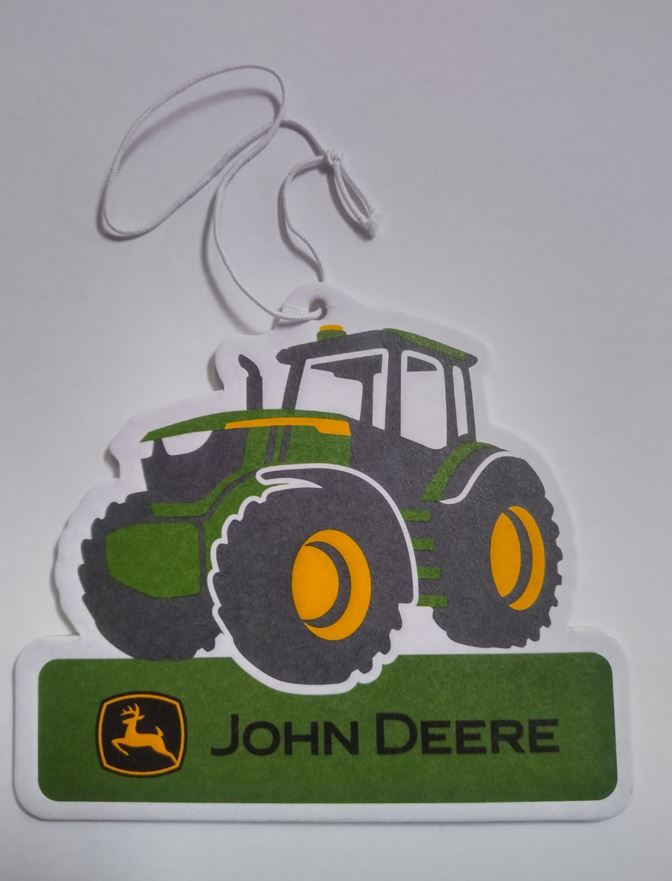 Air Freshener in shape of a tractor, 84mm x 74,2mm, colour green, yellow and black, printed John Deere Logo underneath.