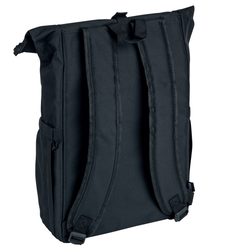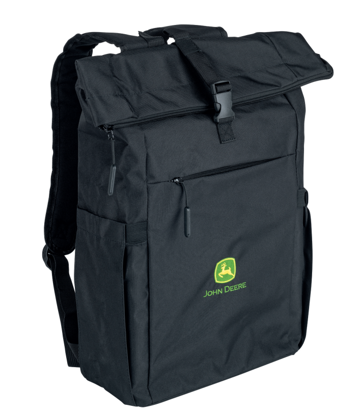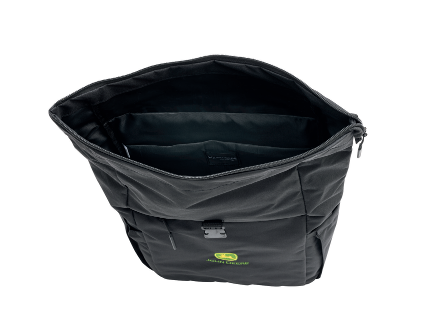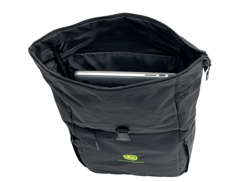 Black Backpack with embroidered John Deere logo. One-way zipper main compartment with click closure. One-way zippered front pocket, padded laptop compartment for up to 16", adjustable padded shoulder straps, padded back, flexible side bottle pockets and air-tag compartment. Capacity: 20L. Dimensions: approx. 55x28x12cm.