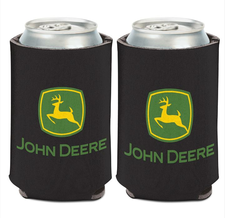 John Deere 12oz Trademark Can Cooler. Black can cooler with a trademark logo on the front and back side. Material: 100% Neoprean.