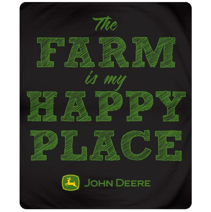 John Deere "Farm is My Happy Place" Blanket. A black and green blanket with a John Deere logo. This light and cosy blanket is the perfect companion for cold days. Material: 100% polyester.