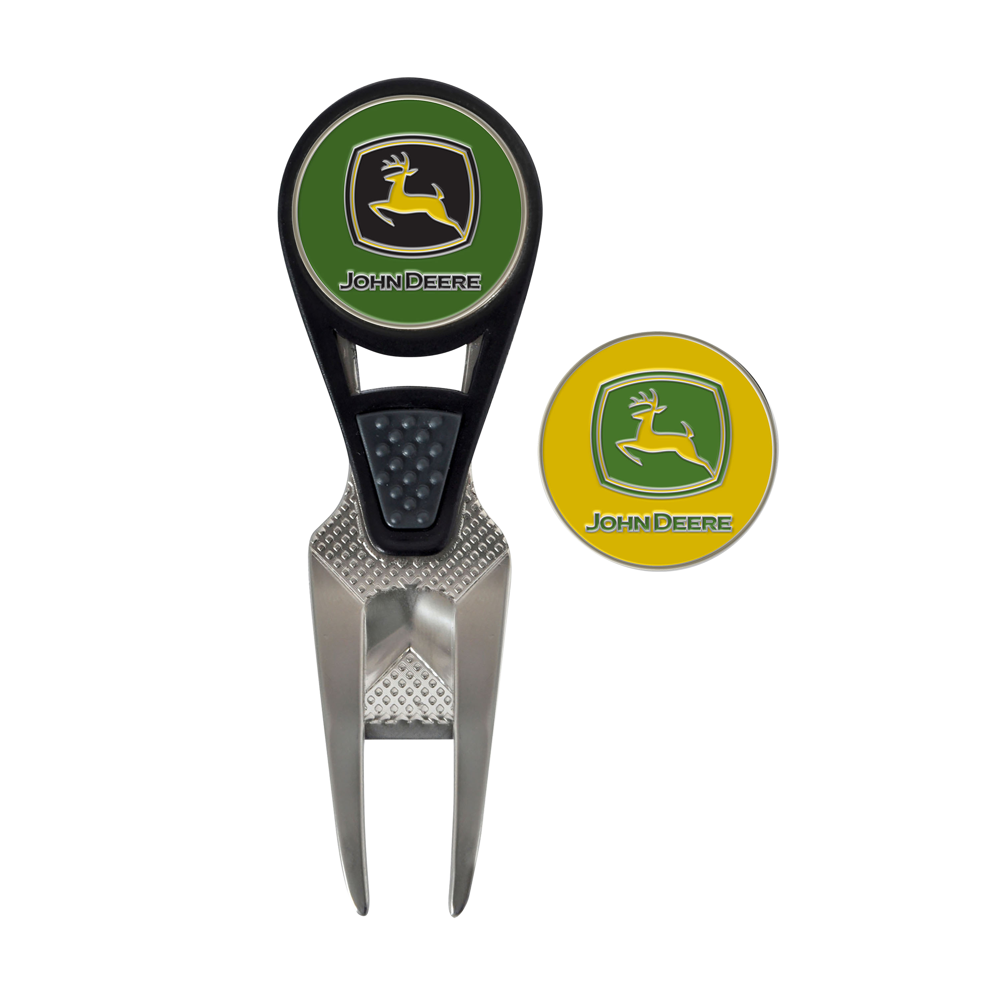 John Deere logo Golf Divot Tool and Marker set. Includes one divot tool and two 25mm ball markers.