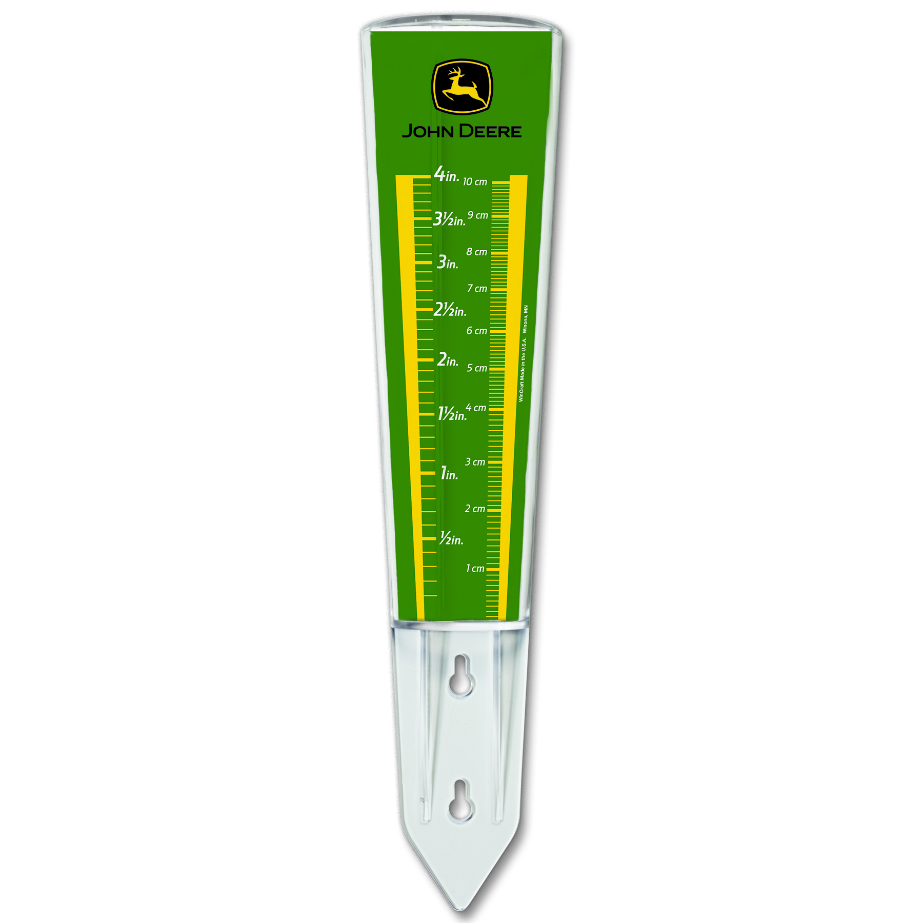 John Deere Trademark Rain Gauge. Green and yellow rain gauge with black John Deere trademark logo. The dimensions are in IN & CM. Material: 100% Plastic.