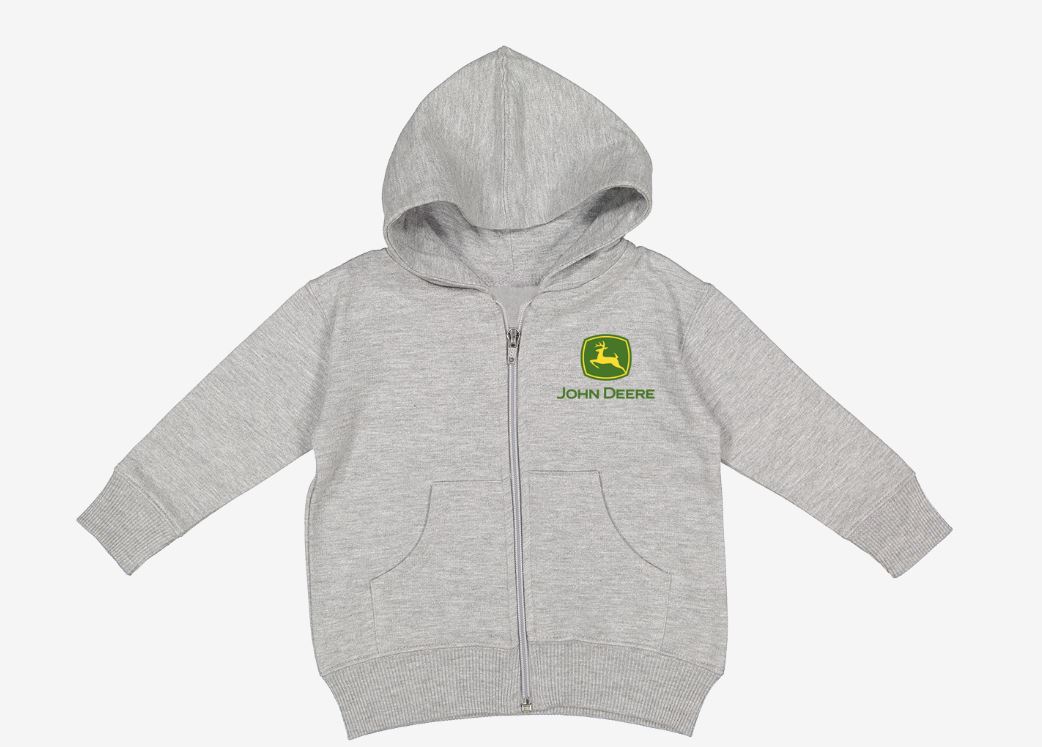 Vista frontal de una sudadera infantil gris con cremallera, capucha, bolsillo delantero y el logotipo de John Deere en el pecho izquierdo.