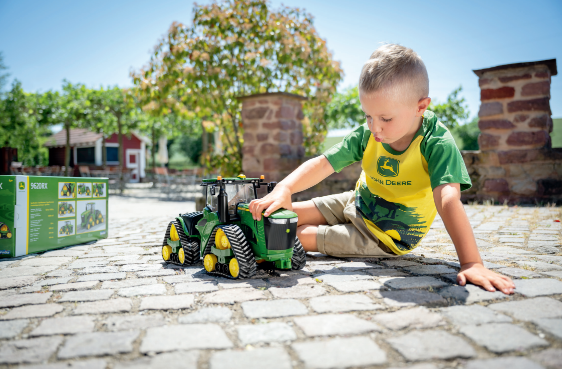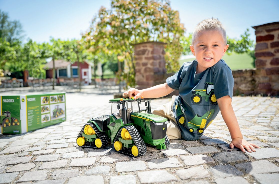 Un niño con una camiseta de John Deere juega con un modelo de tractor de orugas John Deere 9620RX verde y amarillo.