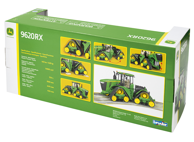 Un impresionante modelo a escala 1:16 del 9620RX. Este tractor ha sido fabricado para ofrecer pura potencia de tracción. Con una potencia máxima de 670 caballos y 4 orugas que proporcionan una tracción inigualable, el 9RX transfiere más potencia al suelo que cualquiera de sus rivales. Esta réplica de BRUDER está fabricada con plástico duradero e incluye diversos detalles y funciones para disfrutarlo jugando. Ideal para jugar en interiores y exteriores. Compatible con otros modelos y accesorios de BRUDER. Dimensiones: 50 x 19 x 23,5 cm. A partir de 3 años.