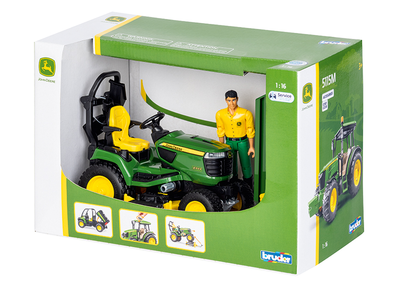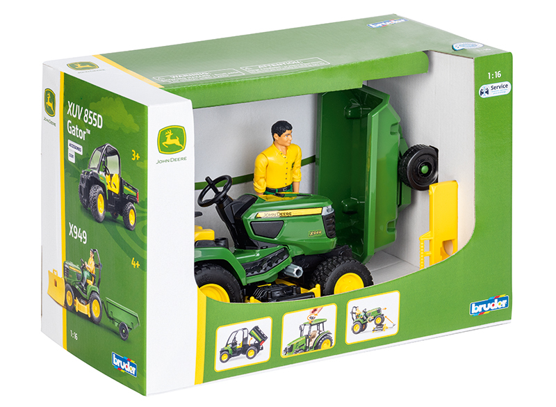 Vista en ángulo de un modelo a escala 1:16 de un tractor de césped John Deere X949 de color verde con asiento amarillo y una figura masculina, expuesto en su caja.