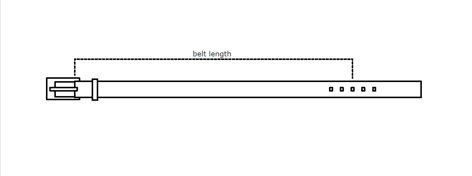 Dibujo lineal que ilustra cómo medir la longitud del cinturón desde la hebilla hasta el agujero central.
