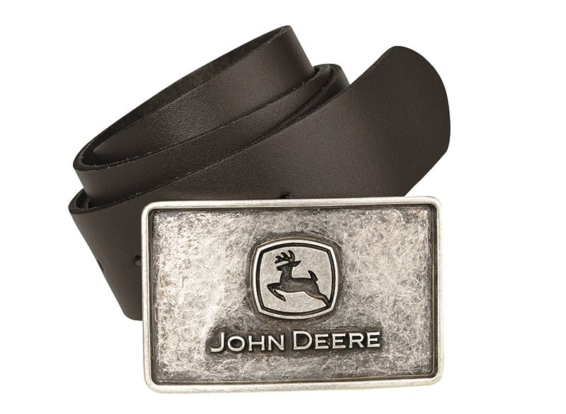Un cinturón de cuero marrón oscuro con una hebilla rectangular de plata envejecida de John Deere, con el logotipo del ciervo saltando y un texto.