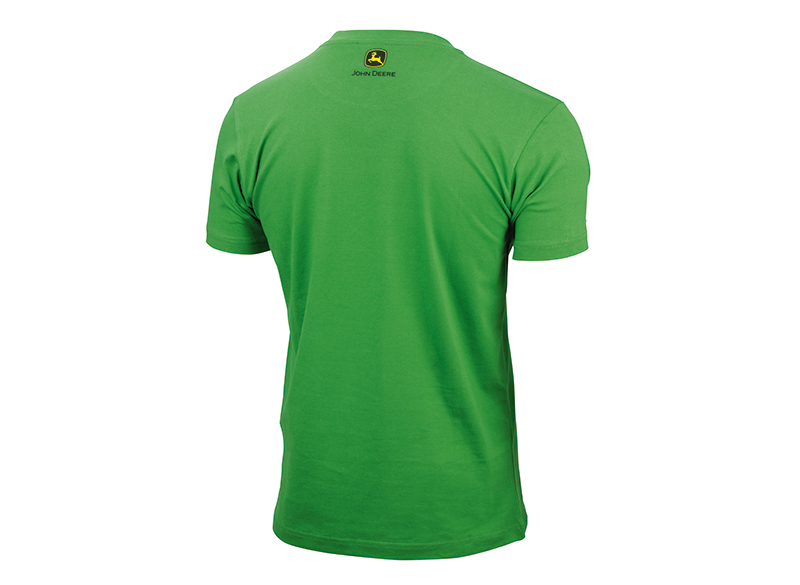 Vista trasera de una camiseta verde de John Deere con el logotipo amarillo de John Deere en la parte superior de la espalda.
