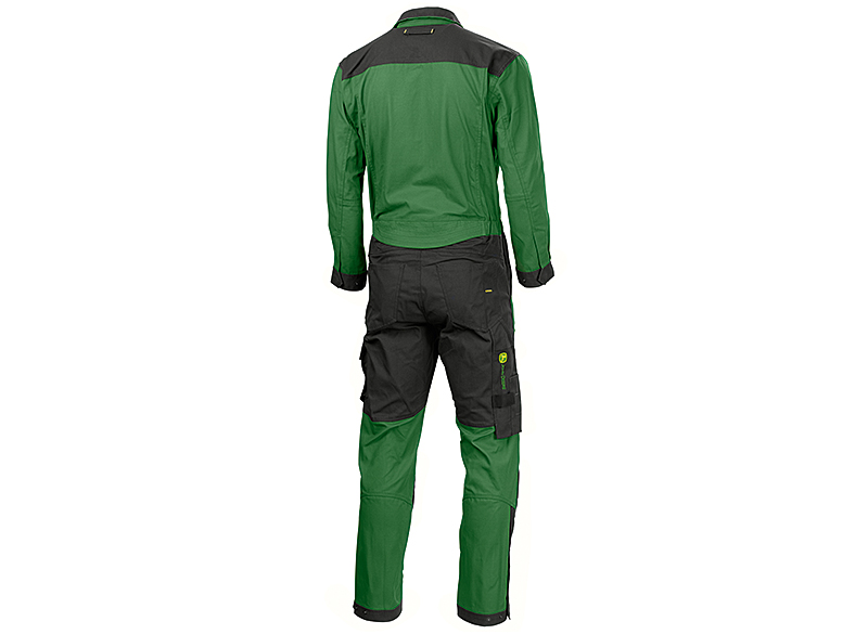 Vista trasera de un mono de trabajo verde y negro de manga larga, con bolsillos cargo y cremalleras en las piernas.