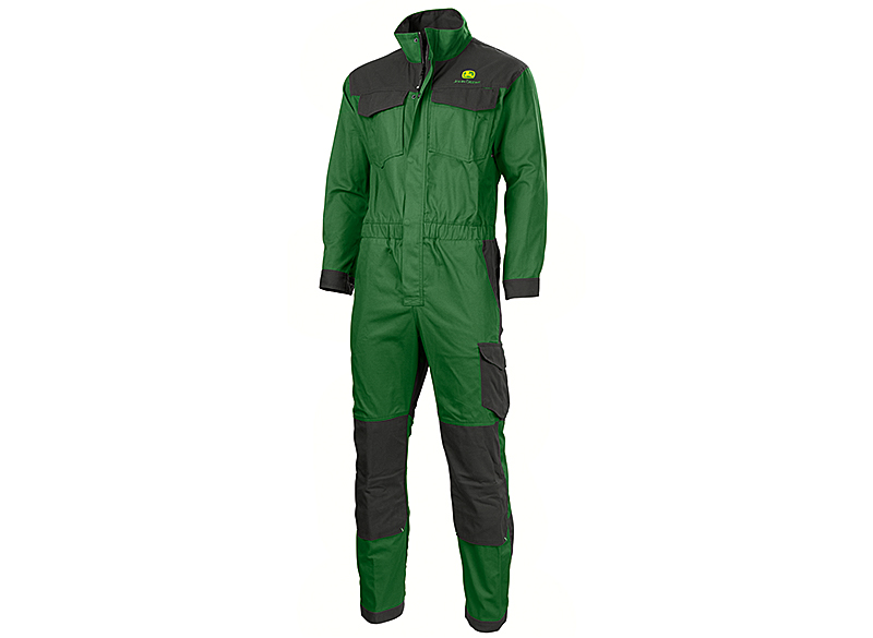 Vista frontal de un mono de trabajo de John Deere de color verde y negro, con un logotipo en el pecho, múltiples bolsillos y rodillas reforzadas.