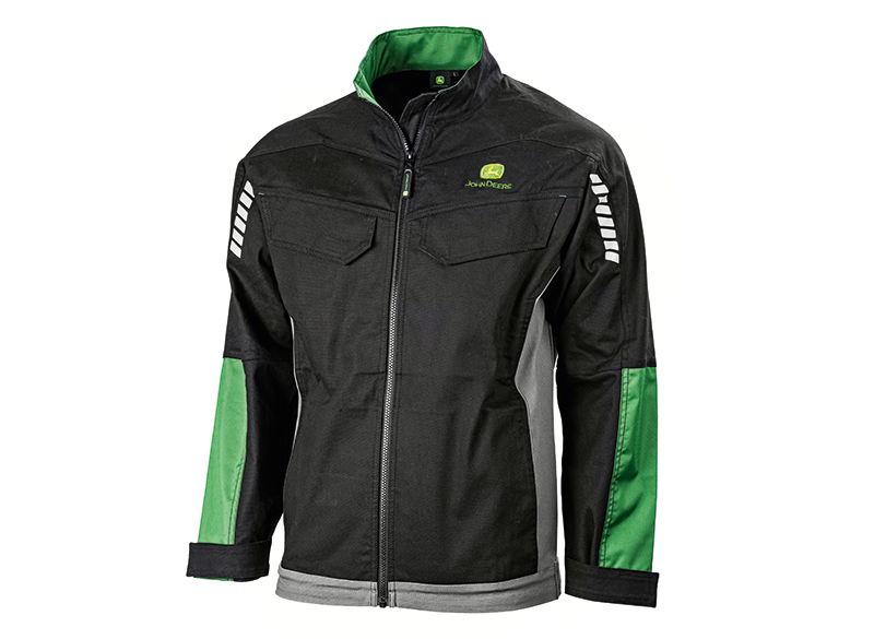Vista frontal de una chaqueta de trabajo de John Deere negra, con detalles verdes, paneles laterales grises y bandas reflectantes en las mangas.