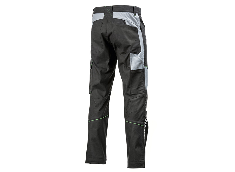 Vista trasera de un pantalón de trabajo gris oscuro con paneles gris claro, bandas reflectantes y bolsillos cargo.
