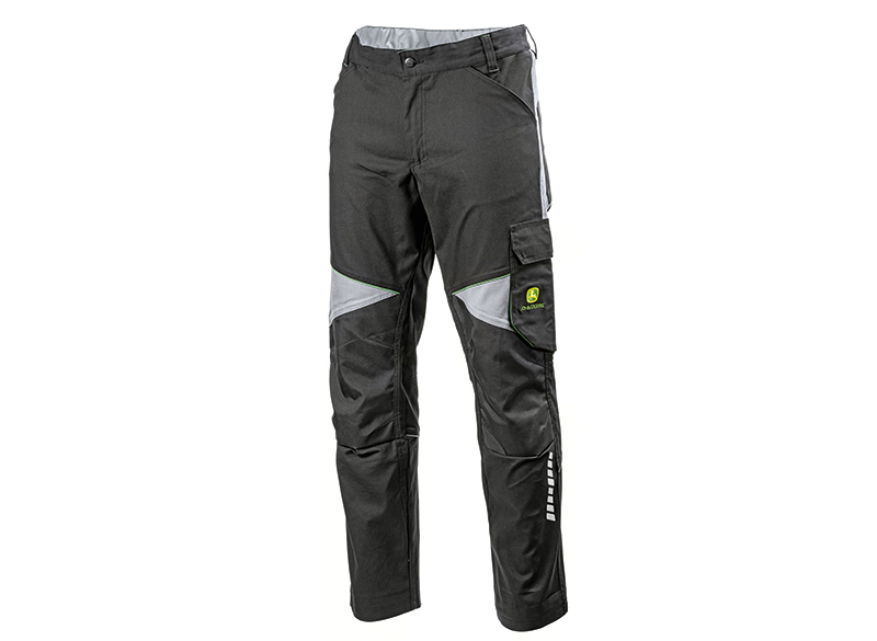 Vista frontal de unos pantalones de trabajo de John Deere de color gris oscuro, con paneles en las rodillas de color gris claro, un bolsillo cargo y bandas reflectantes.