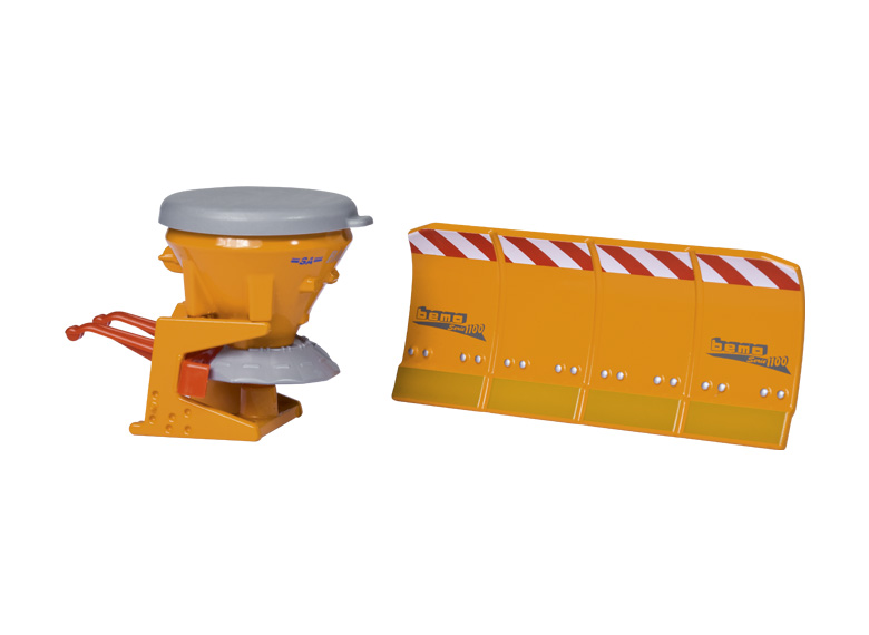 Vista frontal lateral de un modelo a escala de esparcidor de sal naranja, con tapa gris y un quitanieves Bema Snow 100 naranja.