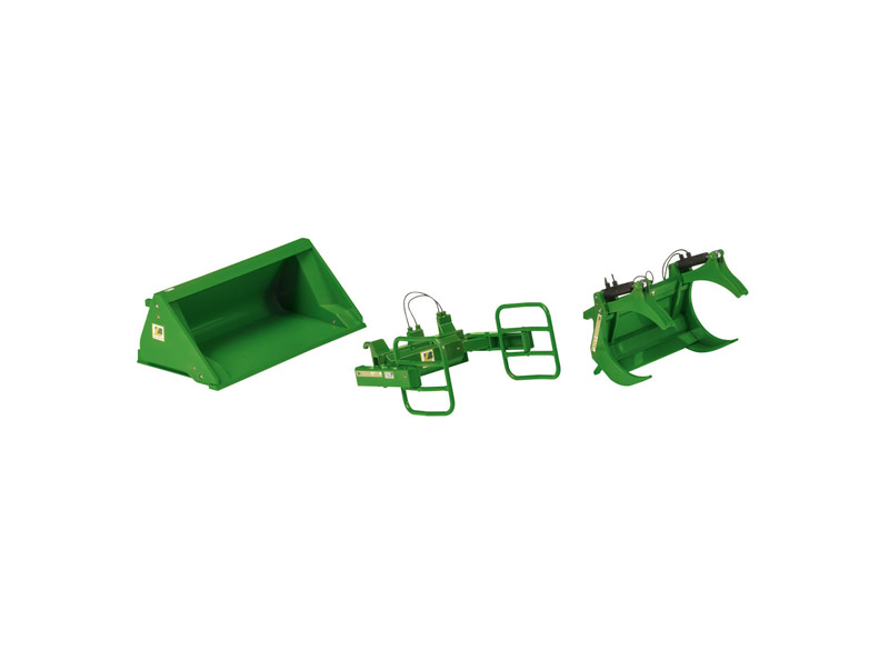 Accesorios para pala cargadora para tractor John Deere con pala cargadora (MCW). El juego incluye 3 accesorios detallados (garra para troncos, garra para pacas, cazo de descarga elevada). A partir de los 14 años.