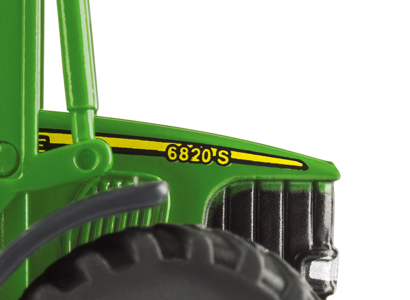 Primer plano del lado frontal de un modelo a escala de tractor John Deere 6820S verde, con una franja amarilla y una rejilla negra.