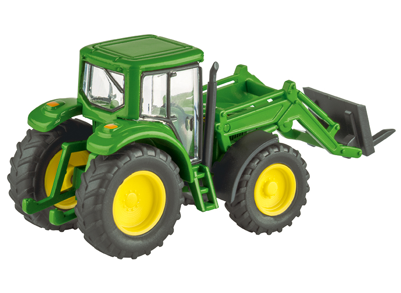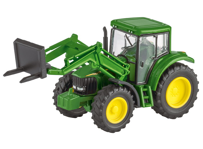 Vista lateral de un modelo a escala de tractor John Deere 6820S verde, con un cargador frontal, horquillas negras y llantas amarillas.