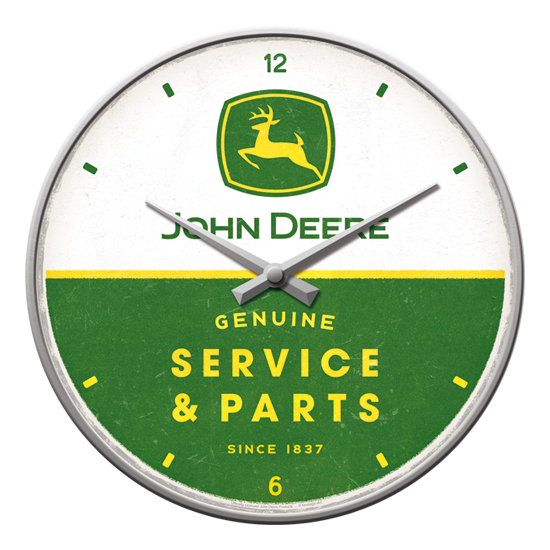 Tässä laadukkaassa John Deere -seinäkellossa on etupuoli kupumaista lasia, metallikotelo ja paristokäyttöinen kvartsikoneisto. Kellon halkaisija on 31 cm ja syvyys noin 5,5 cm. Se toimitetaan tukevassa pahvipakkauksessa ja ilman paristoa.