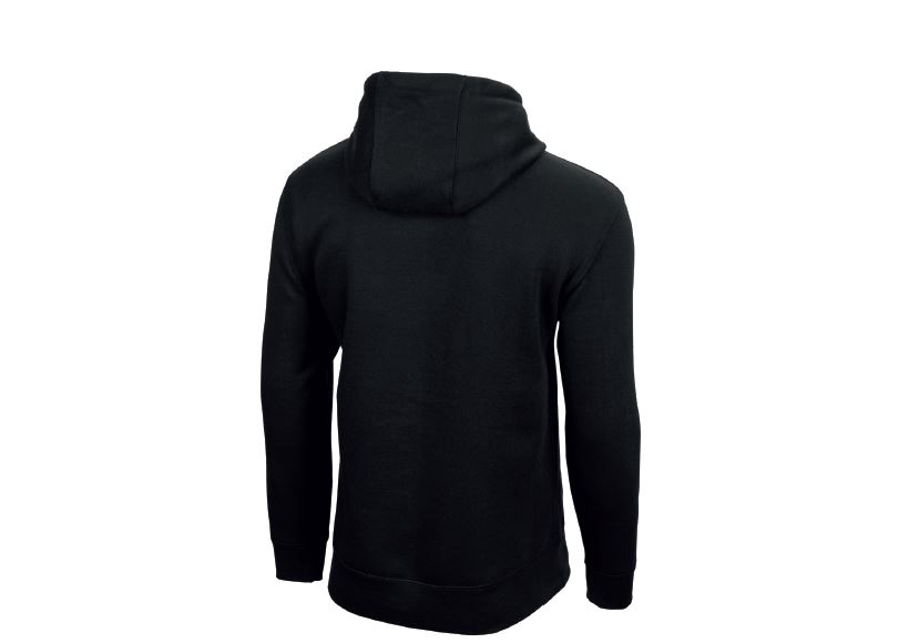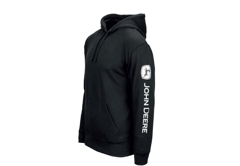 Sweat à capuche en polaire noir John Deere avec logo de marque commerciale sérigraphié sur la manche. Composition : 60 % coton, 40 % polyester